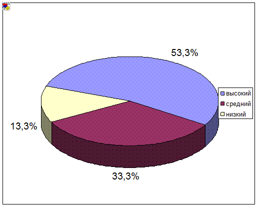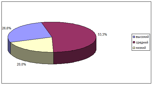 Сначала проведем обобщенный анализ данных. В результате получается, что количество детей с низким уровнем составляет 20 %, со средним – 53,3%, с высоким – 26,6 %.