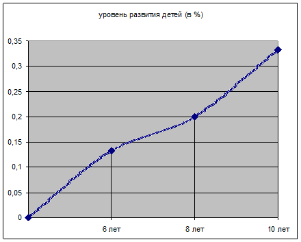 Полученные данные позволяют сделать вывод, что дети шестилетнего возраста имеют низкий уровень развития, затем от шести до восьми лет, учитывая данные исследования, кривая развития начинает расти, а от 8 до 10 лет – снижается. Но, хотелось бы отметить, что у детей шестилетнего возраста, хотя и ниже, чему у других испытуемых ярко выражено стремление составить как можно больше слов, один из испытуемых составил 10 слов, что по данным таблицы характеризуется кА высокий уровень, но поскольку в словах были допущены орфографические ошибки и использованы буквы те, которые отсутствовали в исходном слове, приведенные испытуемым новые слова не учитывались при установлении уровня развития.