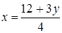 (Одночлен 4х является неизвестным уменьшаемым, чтобы его найти, надо к разности прибавить вычитаемое: 4х=12+3у. Разделим обе части уравнения на 4 и получим: