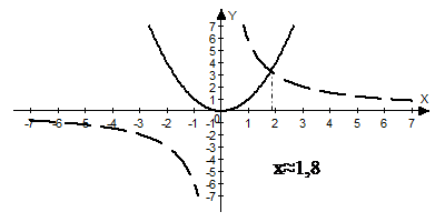 Эти графики пересекаются в одной точке. Абсцисса точки пересечения есть, то значение переменной х, при котором выражение х2 и 6/x принимают равные значения. Значит, абсцисса точки пересечения графиков функций y=x2 и y=6/x является корнем уравнения (x2=6/x). Из рисунка видно, что приближенное значение корня равно 1,8. Примененный способ решения уравнения называют графическим. Абсцисса точки пересечения – корень уравнения.