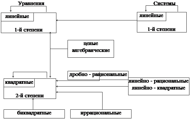 По своему положению в курсе алгебры эта ступень может быть отнесена к прохождению последних тем курса и к итоговому повторению; в результате формируется общая картина связей изученных классов уравнений, неравенств и их систем. Для уравнений и систем уравнений ее можно изобразить в виде схемы