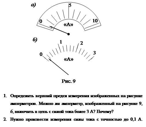 Перед выполнением первых лабораторных работ по электричеству учащимся предложить самостоятельно тренировочные упражнения в определении цены деления шкалы школьных лабораторных амперметров и вольтметров, верхнего и нижнего пределов измерения, а также в отсчете показаний приборов: