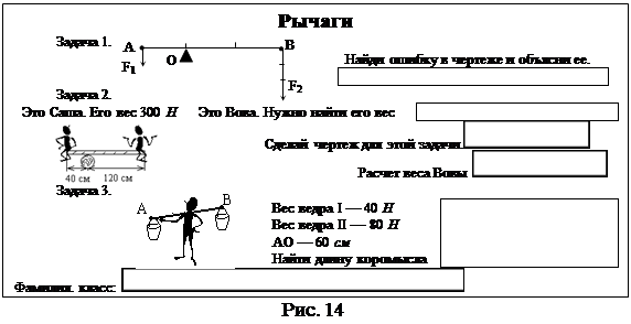 Третий тип — разнообразие карточки-задачи. Они могут состоять из подборки тренировочных упражнений (например, карточка «Рычаги», (рис. 14), ими пользуются при первоначальном закреплении материала; более сложных количественных задач для текущей проверки знаний (такова карточка для XX класса «Расчет электрической цепи», рис. 15); задач, направленных на систематизацию изученного; задач для контрольных работ. Назначение карточек четвертого типа — проверить знание учащимися устройств, приборов и машин, изучаемых в курсе физики. Этой цели служат карточки «Телефон», «Ядерный реактор», «Двигатель внутреннего сгорания». Они составляются, как правило, в повествовательной форме, с пропусками главных слов в тексте; после заполнения форточек получается небольшой связный рассказ.
