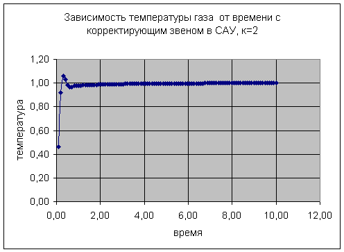 На следующем этапе в систему было включено корректирующее звено, и экспериментальным методом подбирался коэффициент, при котором система была бы устойчивой, и время регулирования было бы минимальным. Исходя из показаний графиков, и критерия Гаусса оптимальным коэффициентом КЗ является k=2.