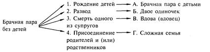 Гипотетическая схема возможного развития семьи начиная с брачной пары без детей определяется через возможные семейные события 1—4 переходом в соответствующие этим событиям типы А—Г: