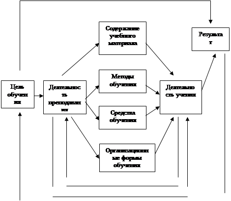 Обучение, как целостная система содержит в себе множество взаимосвязанных элементов: цель, учебную информацию, средства педагогической коммуникации педагога и учащихся, формы их деятельности и способы осуществления педагогического руководства учебной и другими видами деятельности и поведения учащихся.