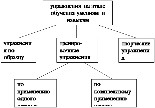 При обучении умениям и навыкам, также как и при закреплении материала, возможны работы как творческого, так и воспроизводящего характера. Схематично виды упражнений на этапе обучения умениям и навыкам можно показать так (см. схему № 2).