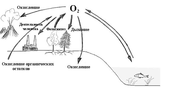 Круговорот кислорода. Кислород - наиболее активный газ. В пределах биосферы происходит быстрый обмен кислорода среды с живыми организмами или их остатками после гибели.
