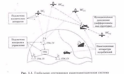 Структура, способы функционирования и требуемые характеристики подсистем СРНС во многом зависят от заданного качества навигационного обеспечения и выбранной концепции навигационных измерений. Для достижения таких важнейших качеств, как непрерывность и высокая точность навигационных определений, в глобальной рабочей зоне в составе современной СРНС типа ГЛОНАСС и GPS функционируют три основные подсистемы (рис. 1):