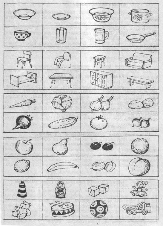 Цель: закрепление в активной речи слов-обобщений: посуда, одежда, овощи, фрукты, мебель, игрушки, а также слов — названий предметов, относящихся к данным группам.