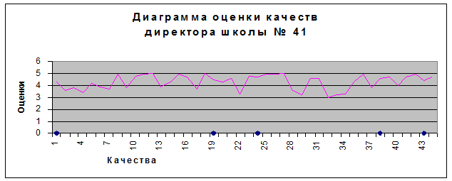 Средняя оценка общечеловеческих качеств директора школы № 41- балла, психофизиологических свойств – , деловых качеств и организаторских способностей – , коммуникативных качеств балла, профессиональных знаний балла.