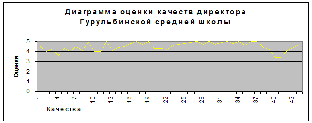 Средняя оценка общечеловеческих качеств директора Гурульбинской средней школы – 4,4 балла психофизиологических свойств – 4,5, деловых качеств и организаторских способностей – 4,5, коммуникативных качеств – 4,7, профессиональных знаний – 3,6 балла. Общая средняя оценка личностных качеств данного руководителя – 4,3. Диаграмма дает возможность увидеть, какие качества оценены ниже остальных, над развитием каких следует поработать, какие совершенствовать.