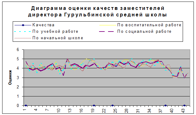 Общая средняя оценка общечеловеческих качеств заместителей директора Гурульбинской средней школы равна 4,2 балла, психофизиологических свойств – 4,3, деловых качеств и организаторских способностей – 4,4, коммуникативных качеств – 4,4, профессиональных знаний – 3,5. Общая средняя оценка по всем качествам заместителей директора школы – 4,2 баллов.