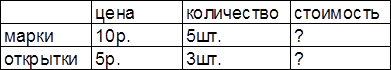 Таблица как вид знаковой модели используется главным образом тогда, когда в задаче имеется несколько взаимосвязанных величин, каждая из которых задана одним или несколькими значениями. Например, «Петя купил 5 марок по 10 рублей каждая и 3 открытки по 5 рублей каждая. Сколько всего денег он потратил на свою покупку?»