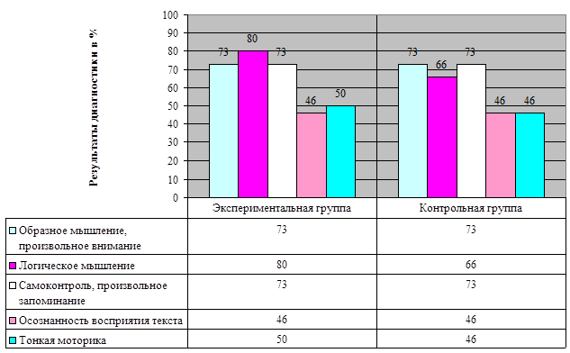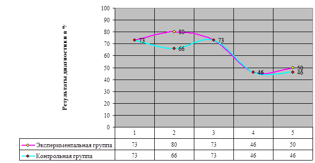 Как видно из сравнительной диаграммы № 2 среднегрупповых результатов диагностики психологической зрелости дошкольников экспериментальной и контрольной групп отличие наблюдается в развитии элементов логического мышления (2). В контрольной группе показатели ниже. По результатам других диагностик показатели приближены в процентном отношении.