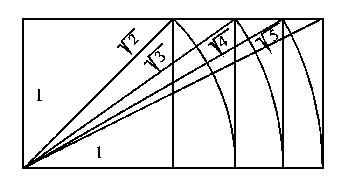 Известно, что уже при постройке первой египетской пирамиды Джосера в Саккаре (около 2800 лет до н.э.) древние зодчие были знакомы с правилами построения так называемых несоизмеримых отрезков, т.е. таких, длины которых нельзя выразить рациональной дробью. Вместе с учениками можно выполнить геометрические построения и еще раз, повторяя теорему Пифагора, вычислить длины диагоналей прямоугольников, изображенных на рисунке. Так, вводя на уроке алгебры понятие иррационального числа, можно геометрически и исторически помочь школьникам понять и почувствовать его суть.