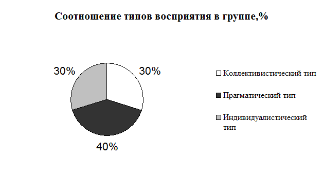 Проанализировав, пришли к выводу, что группа, проучившись вместе 4 месяца, еще не сплотилась в единый коллектив. В группе нет явного лидера. Преобладающий тип восприятия – прагматический, но он выражен не ярко. Наряду с ним, одинаковое место занимают индивидуалистический и коллективистический типы восприятия группы (Диаграмма № 1).
