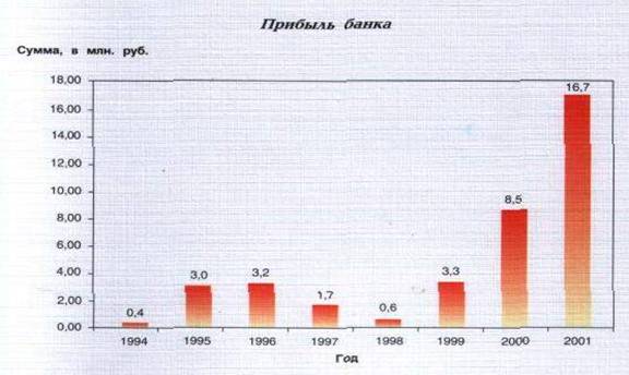 В целях укрепления устойчивости банка и обеспечения интересов клиентов постоянно наращивается резервный фонд банка, который на 01.01.2002 г. составил 4 млн. руб., т.е. увеличен за год в 1,8 раза.