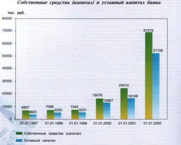 Выбрав стратегию роста, банк проводит целенаправленную работу по постоянному наращиванию собственных средств (капитала) банка, который в 2001 году был увеличен до 67276 тыс. руб., или в 2,8 раза. За последние 5 лет этот рост составил в 10 раз.