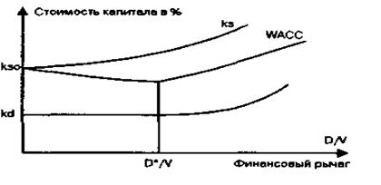 Так как средневзвешенная стоимость капитала определяется из стоимости собственного и заемного капитала и их весов (WACC=kd D/V+ks(V-D)/V), то с увеличением коэффициента задолженности WАСС до определенного уровня D* снижается, а затем начинает расти. Изменение стоимости капитала при увеличении коэффициента задолженности показано на рис.5 [ 4, c.323-