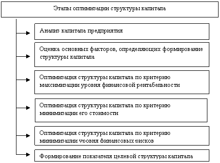 Оптимизация структуры капитала является одной из наиболее важных и сложных задач, решаемых в процессе управления его формированием при создании предприятия. Процесс оптимизации структуры капитала предприятия осуществляется по следующим этапам (рис.7).