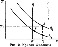 Взаимосвязь между безработицей и инфляцией иллюстрируется обычно посредством так называемой кривой Филлипса. Различают краткосрочную и долгосрочную кривые Филлипса. Последняя выглядит на рис. 2 как прямая вертикальная линия и иллюстрирует тот факт, что в длительном периоде инфляция и безработица не корреспондируют друг с другом. Экономика имеет тенденцию выходить на уровень полной занятости (естественный уровень безработицы) при любых темпах инфляции. В отличие от этого, краткосрочная кривая Филлипса иллюстрирует обратную взаимозависимость между темпами инфляции и уровнем безработицы (см. рис. 2). Сторонники различных экономических школ по-разному обосновывают зависимость, выражаемую краткосрочной кривой Филлипса. Одно из обоснований (соответствующее условиям переходной экономики) состоит в том, что ряд факторов оказывает одновременное и разнонаправленное воздействие на темпы инфляции и уровень безработицы. Выше отмечалось, что жесткая фискальная, бюджетная и кредитно-денежная политика позволяет снизить темпы инфляции. Но в то же время уменьшение бюджетных дотаций убыточным предприятиям, повышение налогов, снижение доступности кредитных ресурсов в условиях экономического спада сопровождается увеличением числа банкротств, способствует более быстрому падению производства, сокращает возможности фирм удерживать избыточные трудовые ресурсы, что приводит к повышению безработицы. И наоборот, стимулирующая бюджетная, фискальная и кредитно-денежная политика, сдерживая в краткосрочном периоде падение производства и рост безработицы, способствует повышению темпов инфляции.