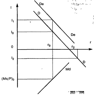 Рост государственных расходов G и сокращение налогов Т смещает DD вправо, что при любой процентной ставке увеличивает I0 и I1 и уменьшает разрыв между предполагаемым и фактическим будущим доходом. Кроме того, государство увеличивает отношение Ms/P, что позволяет уменьшить процентную ставку и увеличить этим I. Если угроза спада остается, то государство осуществляет в случае необходимости льготное кредитование финансовых учреждений, играющих ключевую роль в динамике экономической конъюнктуры. Тем самым спад становится менее глубоким и относительно (т.е. по сравнению с классическим циклом) быстро переходит в новое оживление или подъем.