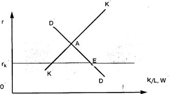 Это равновесие, однако, неустойчиво в длинное время. Его неустойчивость связана с существованием критической величины процента rk. Если r > rk, то чистые сбережения в экономике положительны, при r = rk они равны нулю, а при г < rk отрицательны. Поэтому при любом r > rk предложение капитала увеличивается, но интенсивность этого предложения падает с уменьшением r. На диаграмме этому соответствует сдвиг КК вправо. В результате состояние экономики скользит вниз по DD, приближаясь постепенно к Е. При этом W, K/L и Q/L растут, а r падает. В точке Е r = rk и уменьшение желания сберегать прекращает дальнейшее накопление капитала. W и r перестают изменяться. Это может произойти при высоком уровне дохода и выпуска, если было накоплено значительное количество капитала.