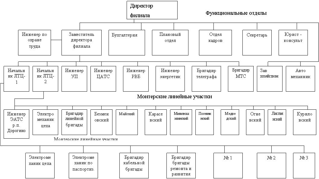 В филиале функциональное управление осуществляется специалистами бухгалтерии, планового отела, юристконсультом, отделом кадров, зам. директора, инженером по охране труда, секретарем-машинисткой и др.