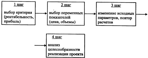 Чувствительность проекта — это устойчивость проекта по отношению к изменениям основных внешних и внутренних параметров, заданных в качестве допустимых. Алгоритм расчета можно представить следующим образом (рис. 4.1):