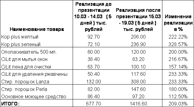 Данные о реализации моющих средств этой фирмы до и после проведения презентации товаров представлены в таблице 2.1.