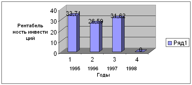Исчисленные показатели свидетельствуют о том, что динамика рентабельности инвестиционной деятельности АСК «Новый Днепр» на макроэкономическом уровне в период с 1995 по 1998 г.г. характеризовалась значительными колебаниями. Если в 1995 году на 1 грн. вложенных средств компании удалось получить 33,71 коп. прибыли, то в 1996 году – только 26,59 коп. Далее в 1997 году наблюдается некоторое увеличение анализируемого показателя – до 31,62%, после чего в 1998 году доход от инвестирования и размещения временно свободных денежных средств страховщика падает до нуля, соответственно доводя показатель рентабельности инвестиций до нулевой отметки. Отмеченные тенденции демонстрирует диаграмма (рис. 2.7).