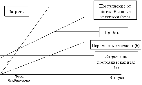 4. Учет затрат. Если спрос определяет верхний порог цены, то затраты устанавливают нижний. В обычной ситуации рентабельная организация стремится, чтобы устанавливаемые цены покрывали валовые издержки производства и маркетинга, а также, чтобы оставалась еще и достаточная прибыль. Во многих фирмах процесс выработки ценовых решений начинается с учета затрат. К примеру, на единицу продукции рассчитываются затраты, прибавляется процент на прибыль и определяется окончательная цена. Подобные методы сложения затрат и прибыли для получения цены, при всей кажущейся простоте, не всегда продуктивны. Как и в случае со спросом учесть затраты оказывается крайне не просто. Одна важная особенность, часто упускаемая из виду при подходе «затраты + прибыль», заключается в том, что не учитывается различие между переменными и постоянными затратами на производство товаров. А основные капитальные затраты (аренда и тарифы) не меняются, они постоянны и не зависят от объемов выпущенной продукции. Переменные же затраты зависят от уровня загрузки производства, а он меняется: растет загрузка, растут соответственно и затраты на переменный капитал. И на оборот, если производство уменьшается (например понижаются, непосредственные затраты) становится меньше и переменные затраты. Это внешне простое различие постоянных и переменных затрат. Правильный учет затрат позволяет производить анализ рентабельности анализ безубыточности. Рисунок 12 иллюстрирует это понятие. Основные затраты, переменные затраты и валовые затраты нанесены на графике одновременно, дана кривая поступления от сбыта. Точка, в которой кривая поступлений пересекает кривую валовых затрат, называется точкой безубыточности. Это означает, что фирма