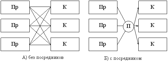 Схема (рис. 13) наглядно показывает, как наличие посредника (П) резко сокращает число необходимых контактов производителей (ПР) с клиентами (К). Из схемы видно, что три фирмы-производителя, работая напрямую с тремя клиентами, должны установит с ними девять связей. Работа через посредника сокращает число таких контактов до шести. Это позволяет существенно уменьшить расходы на сбыт товара.