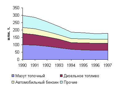 Первичная переработка нефтяного сырья составила в 1997 г. 177,6 млн. т., что на 1,1% больше, чем в 1996 г. Глубина переработки возросла на 1,2% и составила 63,7%. Особенно вырос выпуск бензина высокооктановых (на 14,2%) и неэтилированных марок (на 28,1%). Производство неэтилированного бензина составило 67,7% от общего объема выпуска. При этом загрузка большинства нефтеперерабатывающих заводов остается низкой (среднеотраслевой показатель – около 60%).