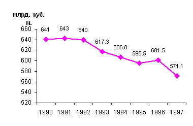 В газовой промышленности в 1997 г. продолжилось сокращение добычи, вызванное снижением спроса со стороны как отечественных, так и зарубежных потребителей (рис 4)[9]. Всего в России в 1997 г. было добыто 571,1 млрд. куб. м. природного газа (94,9% к уровню 1996 г.) Основная проблема отрасли – неплатежи за газ со стороны потребителей. За 1997 г. их задолженность увеличилась на 34% и на начало 1998 г. составляла 23,7 млрд. руб. Несмотря на многократные попытки стимулировать своевременные расчеты снижением тарифов для добросовестных плательщиков и ограничениями поставки газа должникам, средний срок расчета с поставщиками в газовой промышленности превысил 40 месяцев. Низка и доля оплаты газа денежными средствами - за первые 5 месяцев 1998 г. доля оплаты за газ “живыми деньгами” составила 14% по России и 8,1% по СНГ.