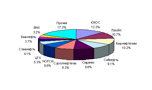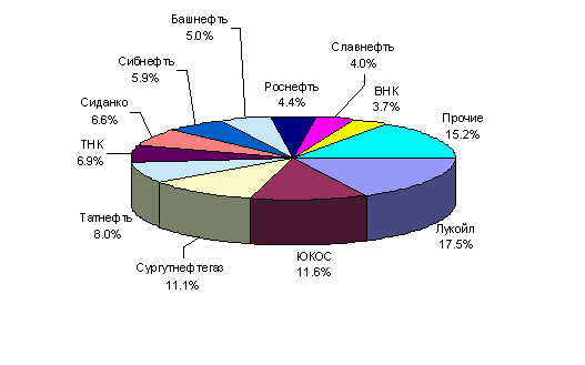 В процессе реорганизации и приватизации в России сформировались 13 крупных нефтяных компаний: Лукойл, Сургутнефтегаз, Юкос, Татнефть, Сиданко, Тюменская нефтяная компания, Сибнефть, Роснефть, Башнефть, Славнефть, Восточная нефтяная компания, Онако, КомиТЭК. Всего же на начало 1998 г. добычу нефти в России осуществляли 149 предприятий (рис.5)[10].