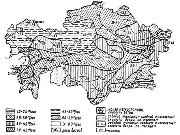 Рис.2 Карта-схема среднегодовых скоростей ветра в Казахстане и годовой повторяемости направления ветра.