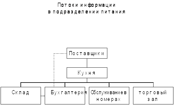 Информация от поставщиков попадает на кухню шеф-повару. Если она касается пополенеия склада, то она проходит через бухгалтерию, где поступивший товар оформляется документально. В отдел бухгалтерии поступает также поток финансовой информации о полученной выручке. Из отдела обслуживания в номерах на центральный кухонный терминал потупают заказы от гостей отеля. Также заказы поступают и из торгового зала.