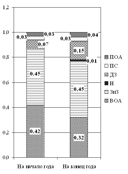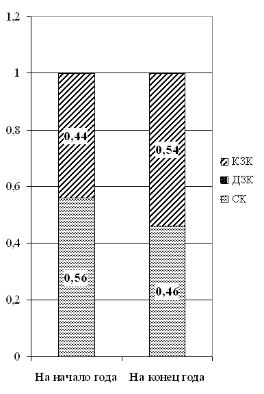 По данным аналитического баланса осуществляется построение стоимостных диаграмм финансового состояния на начало и на конец периода (рис.1), позволяющих наглядно представить качественные изменения в структуре имущества и капитала анализируемого субъекта хозяйствования. Диаграмма финансового состояния - это прямоугольник, левая и правая части которого соответствуют активу и пассиву баланса предприятия. Сегменты в правой и левой частях диаграммы отражают удельный вес элементов имущества и капитала.