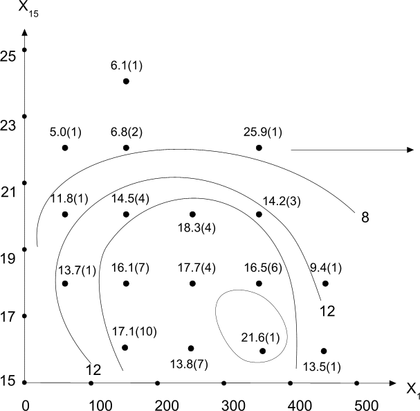 Рис. 2.1. зависимость урожайности кориандра посевного (ц/га) от суммы осадков (C1, мм) и средней температуры воздуха (Х15, °С) за период вегетации. Сорт Янтарь. [17]