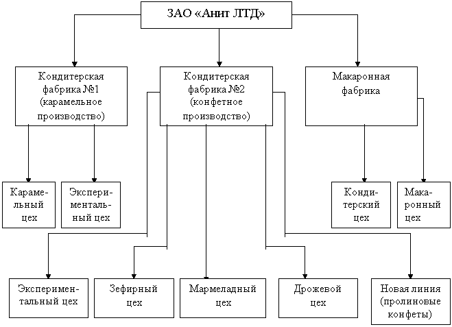 Структурные подразделения (см. Рисунок 2), входящие в предприятие ЗАО «Анит ЛТД» расположены на трех территориях: кондитерская фабрика №1 находится на ул. Седина, 131; кондитерская фабрика №2 - ул. Тихорецкая,7; макаронное производство – ул. Ставропольская, 3. Обособленность территорий позволяет каждое производство сделать хозрасчетной единицей, что является немаловажным фактором при ведении управленческого учета, в частности: информация о поведении затрат, полной себестоимости каждого производства и т. д. Предприятие имеет высокий интеллектуальный потенциал. В объеме производства 39% выпускаемой продукции - новые виды изделий, разработанные специалистами предприятия. Совсем недавно предприятие начало выпускать пролиновые конфеты «Соната» - это шоколадные конфеты с орехами фундук.