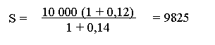 Пример 1: Заемщик взял в кредит 10 тыс. руб. на год под 12% годовых при сложных процентах. Требуется определить покупательную способность денег при уровне инфляции 14% в год по формуле: