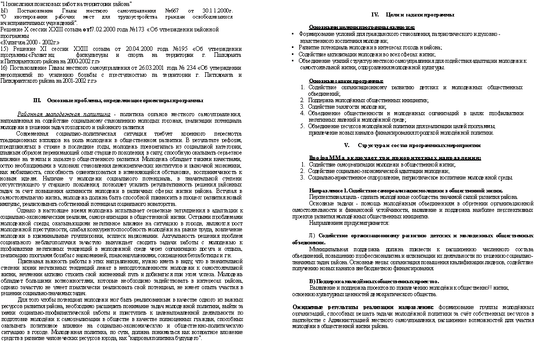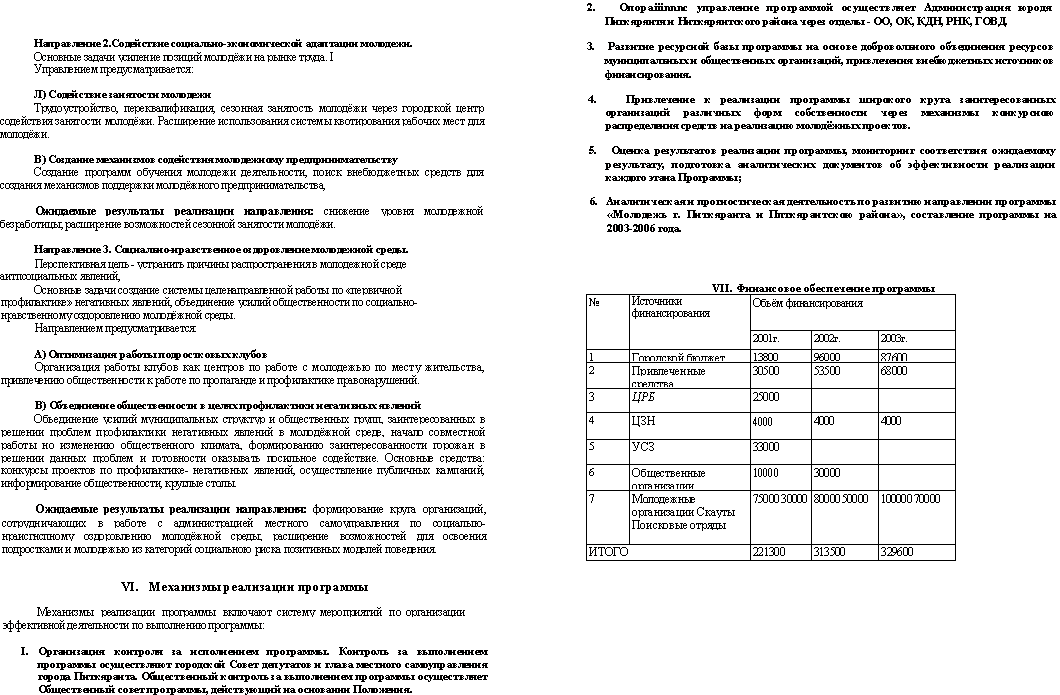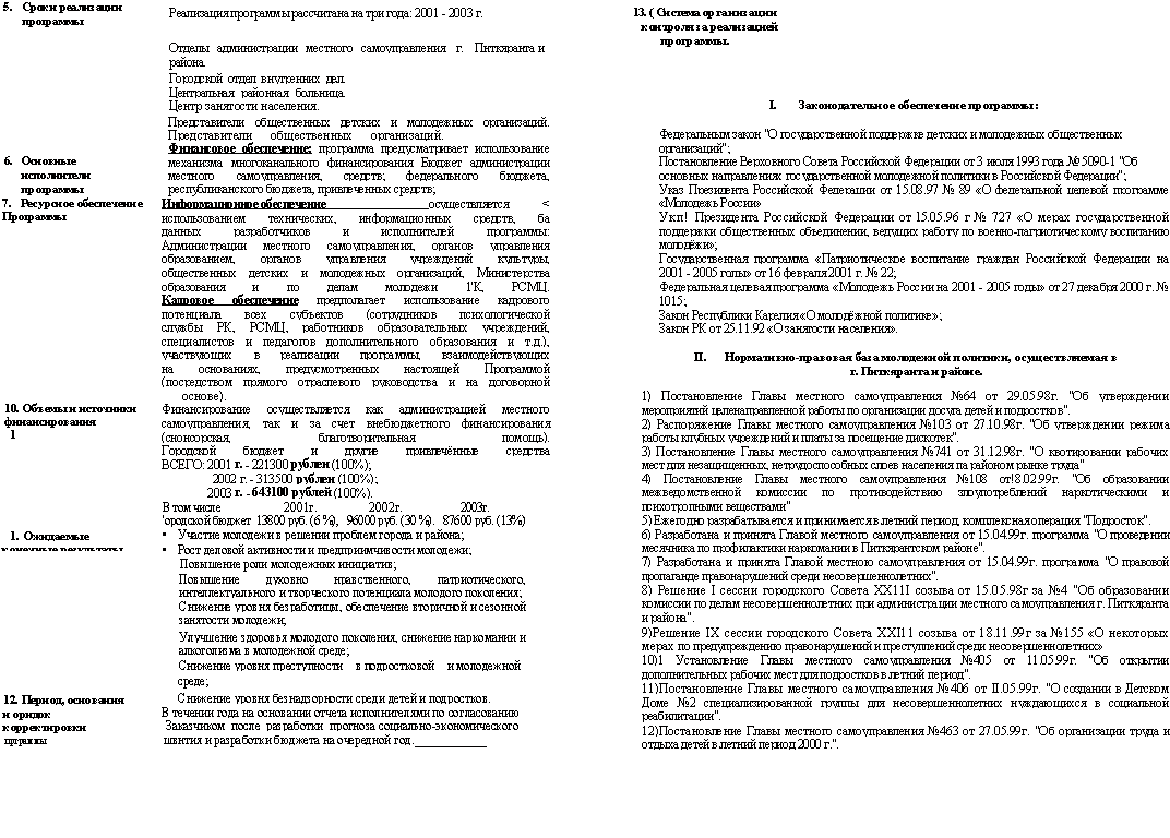 VIII. Ожидаемые результаты 1. Создание в молодежной среде условий способствующих формированию гражданской - патриотической позиции, воспитанию уважения к истории, культуре, традициям; 2. Формирование группы молодёжных организаций, способных решать задачи молодежной политики за счёт собственных ресурсов в партнёрстве с Администрацией города и района; 3. Расширение возможностей для участия молодёжи в общественной жизни города; 4. Снижение уровня молодежной безработицы; 5. Расширение возможностей сезонной занятости молодёжи; 6. Формирование круга организаций, сотрудничающих с Администрацией города и района в работе по социально-нравственному оздоровлению молодёжной среды; 7. Привлечение в городскую молодёжную политику внебюджетных источников финансирования. | ||||||||||||||||||||||||||||||||||||||||||||||||||||||||||