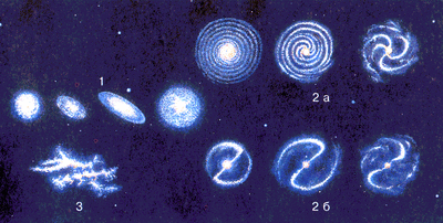 Рис. 2. Классы галактик: 1 — эллиптические (E); 2 — спиральные (S) (а — нормальные, б — с перемычкой); 3 — неправильные (Ir) |