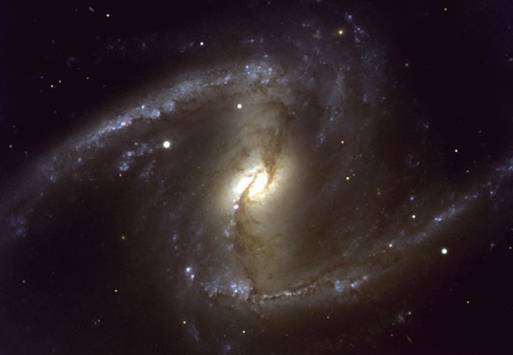 На следующей фотографии показана NGC 1365 (Рис. 3) — своеобразная «классика» спиральной галактики. Эта массивная галактика имеет диаметр в 200,000 световых лет и удалена от нас на 60 миллионов световых лет. Это одна из галактик из звездного скопления Fornax. Через центр галактики проходит преграда, которая охватывает ее ядро. Это целая система из спиральных рукавов и преград вращает медленно по часовой стрелке и проходит 350 миллионов лет, чтобы завершить один полный поворот. Подобно многим спиральным галактикам центральная область ее состоит из старших, более красных звезд. Спиральные рукава содержат молодые синие звезды