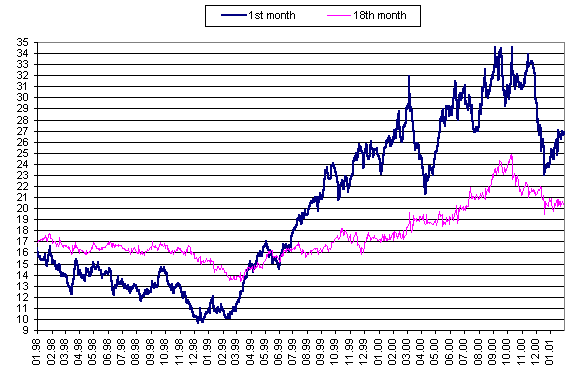 В момент прекращения торговли фьючерсами на LIPE часто возникает интересный эффект, проявляющийся в разнонаправленном скачке цен. Дело в том, что торговля фьючерсами с исполнением в ближайший месяц в Лондоне заканчивается в последний банковский день за 15 дней до первого числа этого месяца, а в Нью-Йорке – как минимум за три дня до 25 календарного торгового дня предшествующего месяца. На практике это означает, что переход к следующему контракту на LIPE происходит на 5-7 дней раньше, чем на NYMEX. Фьючерсы же обладают определенной временной структурой, типичной для складируемых товаров. Так, ближайшие фьючерсы гораздо более волатильны дальних, относительно которых есть устойчивые долгосрочные ожидания. Для смеси Brent цена на нефть последние 15 лет колебалась в среднем около 17,5 долл. за баррель. Когда она опускалась ниже этого уровня, как с начала 1998 года по середину марта 1999-го, имело место контанго (contango), т.е. рост цен с отдалением срока исполнения (см. рис. 3). В последнее время в связи с тем, что ОПЕК установил нижнюю границу для своей нефтяной корзины в 22 долл. за баррель, соответственно выросла долгосрочная ожидаемая цена. Однако с июля 1999 года по настоящее время, поскольку текущие цены выше этого уровня, наблюдается бэквардация (backwardation). В результате сегодня при переходе на новый контракт цены, как правило, падают, даже если рынок в целом растет, т.е. котировки Brent и WTI могут двигаться в различных направлениях.