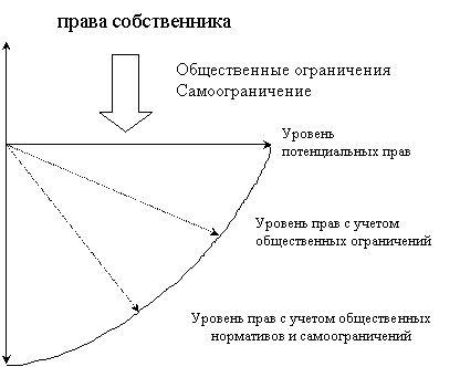 Вместе с тем возможности, права владельца всегда определенным образом ограничиваются. На рис. весь сектор (стрелка в горизонтальном положении) — это потенциальные права владельца. Реальное положение вещей складывается таким образом, что в горизонтальном положении стрелка никогда не находится: с одной стороны, общество, используя государство, всегда ограничивает права собственника, а с другой — нередко сам собственник сознательно ограничивает, уменьшает сектор своих прав на объект. Рассмотрим, в чем состоят цели и суть этих ограничений.