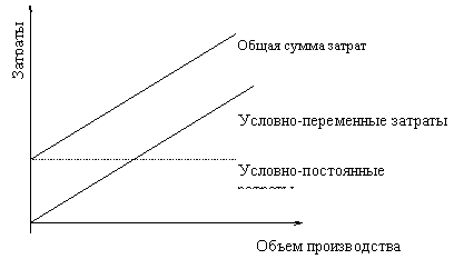 Большое влияние на величину затрат оказывает объем производства. Все затраты делятся на условно-постоянные и условно-пропорциональные (переменные). Условно-постоянные не зависят от объема производства, условно-переменные же наоборот.