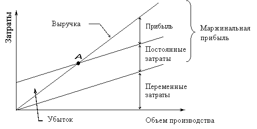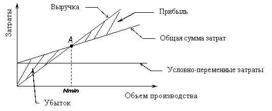 Совместив график затрат с графиком выручки, получили точку А, т.е. минимальный размер реализации продукции, обеспечивающий бесприбыльную и безубыточную работу предприятия.